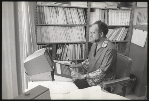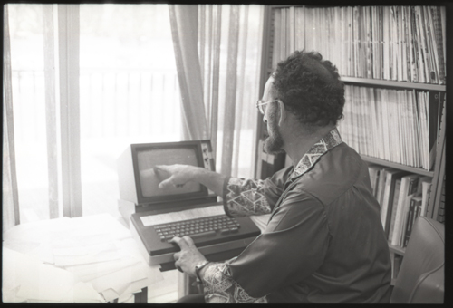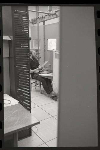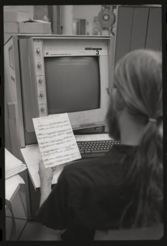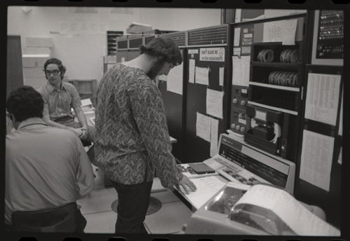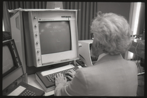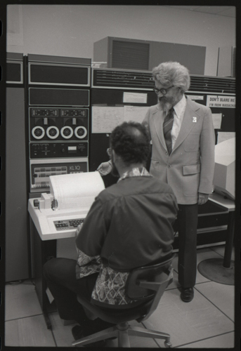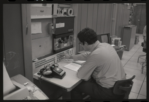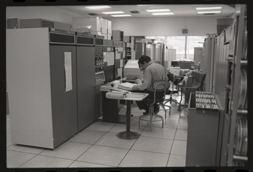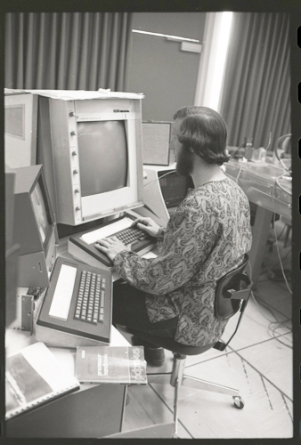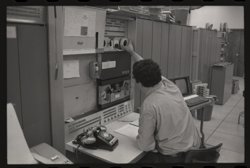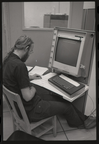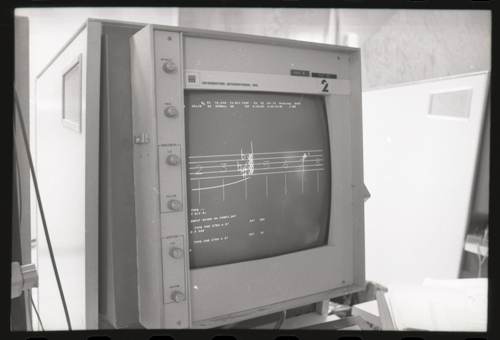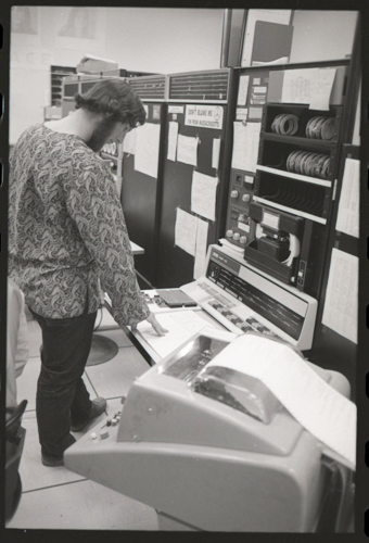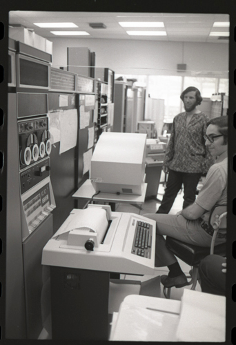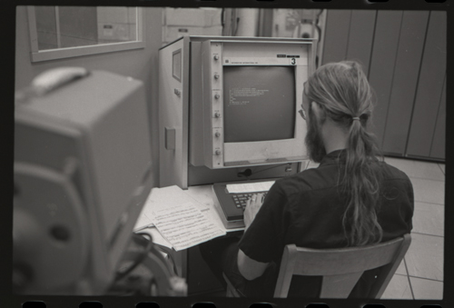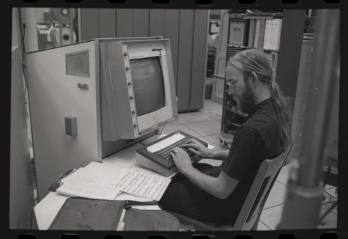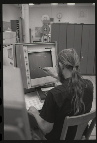 in the picture he is at Triple-III display#1 which is session line tv#021 ! +-----+-----+--------+---------------------+---------------------+---------+--------+---------+---------+ | prj | prg | ln | login | logout | minutes | sn | runtime | kcticks | +-----+-----+--------+---------------------+---------------------+---------+--------+---------+---------+ | F75 | JMC | tv#015 | 1976-04-21 02:48:00 | 1976-04-21 03:03:00 | 15 | 211352 | 11257 | 392448 | | ESS | JMC | tv#015 | 1976-04-21 08:27:00 | 1976-04-21 08:28:00 | 1 | 211352 | 68 | 880 | | ESS | JMC | tv#037 | 1976-04-21 11:18:00 | 1976-04-21 11:55:00 | 37 | 211352 | 89 | 1188 | | ESS | JMC | tv#021 | 1976-04-21 12:16:00 | 1976-04-21 12:19:00 | 3 | 211352 | 170 | 5512 | | ESS | JMC | tv#037 | 1976-04-21 14:45:00 | 1976-04-21 16:36:00 | 111 | 211352 | 3190 | 51776 | | ESS | JMC | tv#777 | 1976-04-21 23:23:00 | 1976-04-21 23:24:00 | 1 | 211352 | 32 | 1166 | | ESS | JMC | tv#015 | 1976-04-21 23:05:00 | 1976-04-22 00:32:00 | 87 | 212425 | 2654 | 67504 | +-----+-----+--------+---------------------+---------------------+---------+--------+---------+---------+