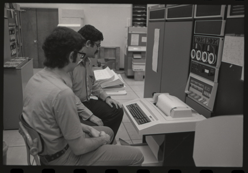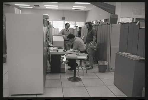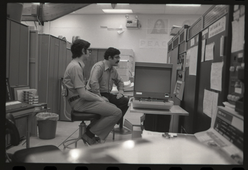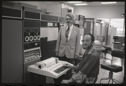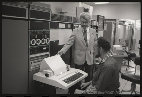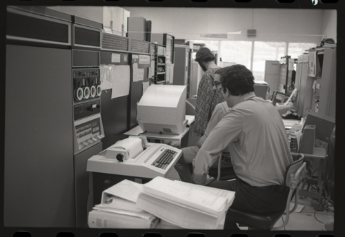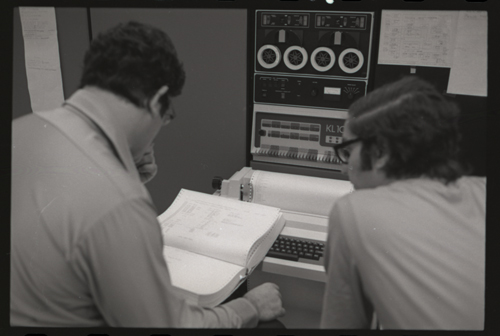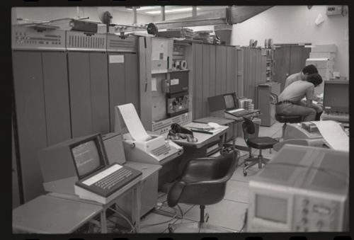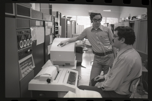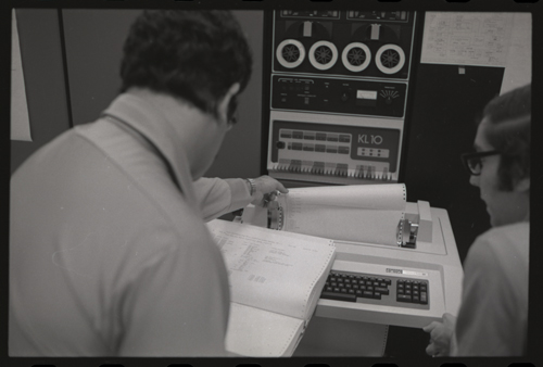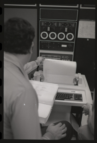 While our wizards are waiting for something at the KL-10 DECwriter. The photographer has captured the photo shy XGP, the famous Xerox Graphics Printer, jumps out of the backgound in the center of this image.