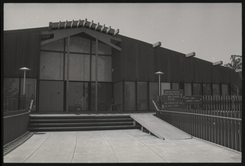 The Visitor drives down a road lined with eucalyptus trees, to arrive at the Donald Clinton Power Laboratory, 1600 Arastradero, Palo Alto, California. Home of SAIL, the first Stanford Artificial Intelligence Laboratory. The Visitor walks up the wide steps to the front door of the unusally shaped semi circular wooden building.