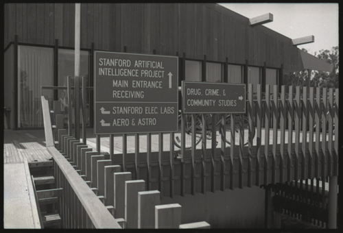 Close up of signage mounted on the front railing of SAIL's deck. The visitor will go straight ahead to "Main Entrance" of "Stanford Artificial Intelligence Project". Nothing further is to be found concerning "Drug, Crime & Community Studies", it would have been a long walk to the right around the outer circumference of the upper deck. It is now 1976, and the further signage concerning community studies disappeared years before.