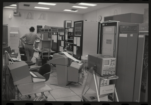 Note: The telephone head set is placed on the desk top phone in its normal position. And a computer floor tile pulling suction tool (aka "The Floor Sucker") sits on the PDP-6 console next to the telephone,