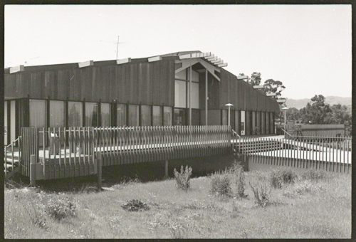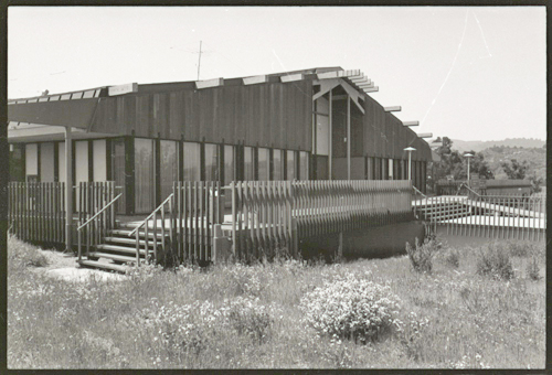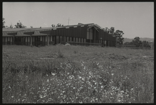 Upon leaving the building, the Visitor has gone down those wooden steps, out on the grass, towards the volley ball court and now looks back at the building for a wide angle shot with spring weeds blooming in the foreground, and the dark profile of the Eucalyptus trees showing behind the building, the distant gray skyline on the right is the Santa Cruz mountains, looking at the Russian Ridge and Windy Hill segments.