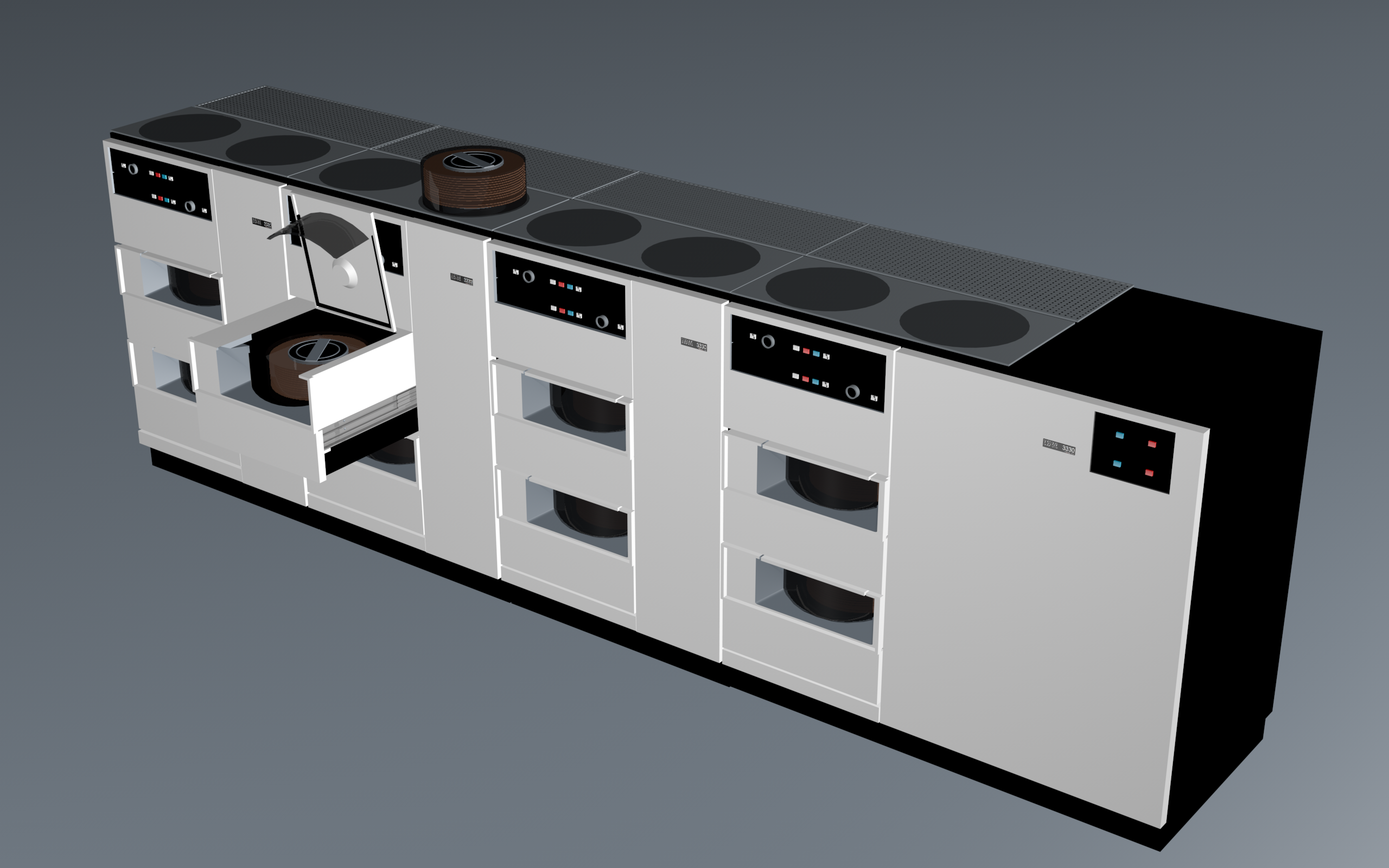 The shared online SAIL file system in late 1974 was implemented on three disk packs of a four drive IBM-3330 storage system smaller than the one in the picture.
